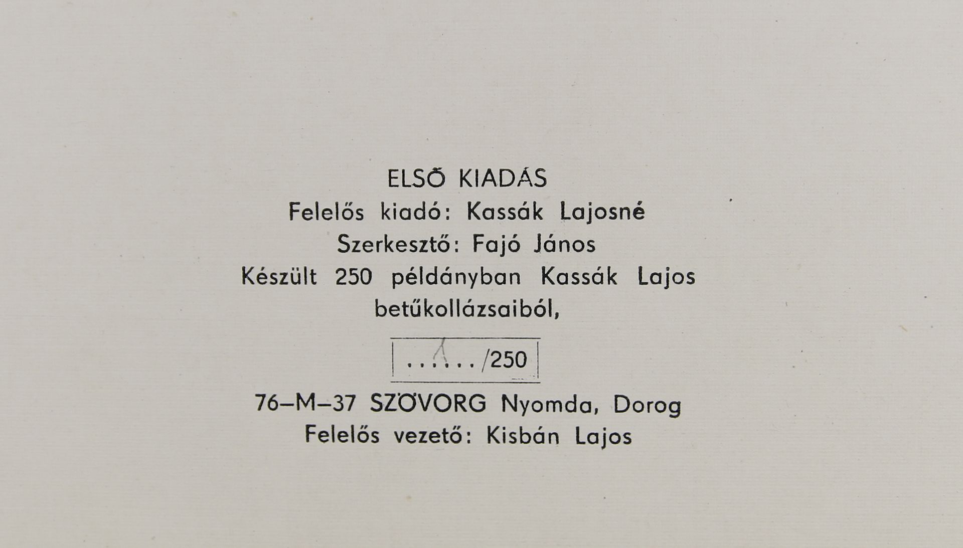 Készült 250 példányban Kassák Lajos betűkollázsaiból.