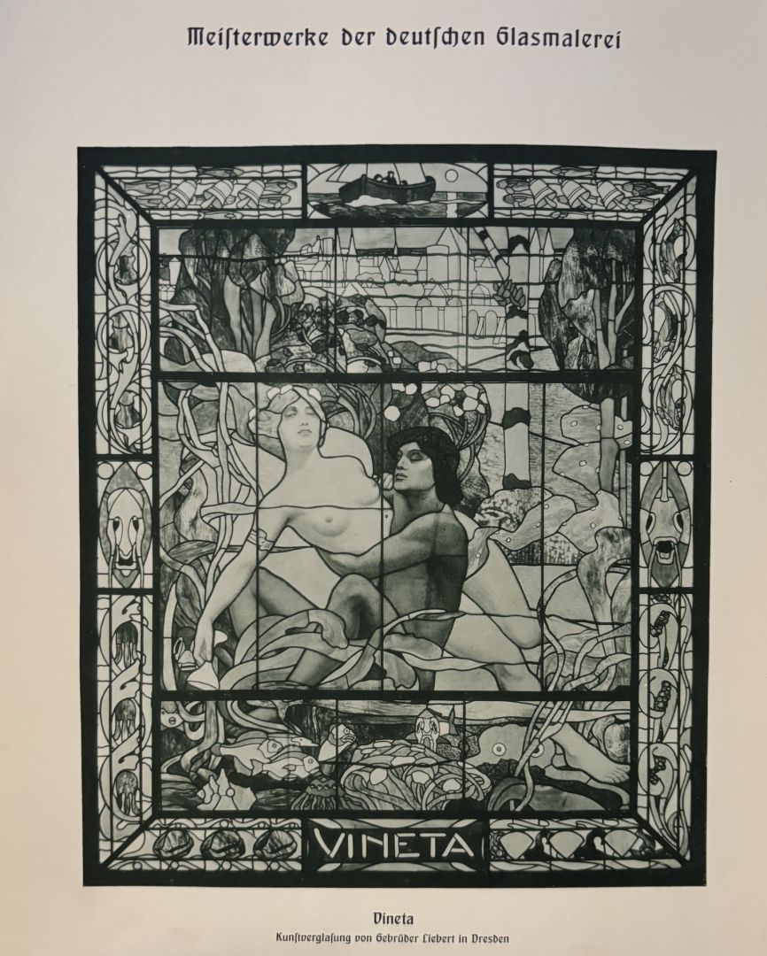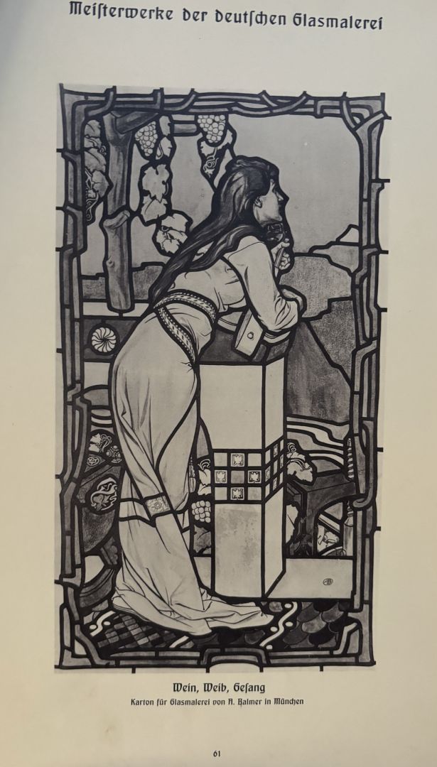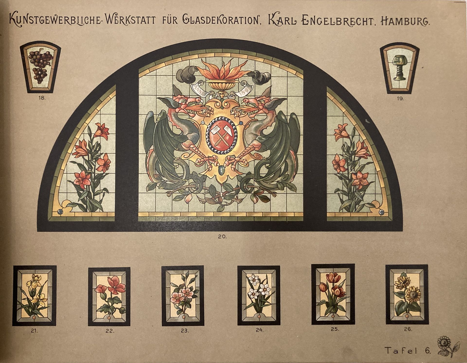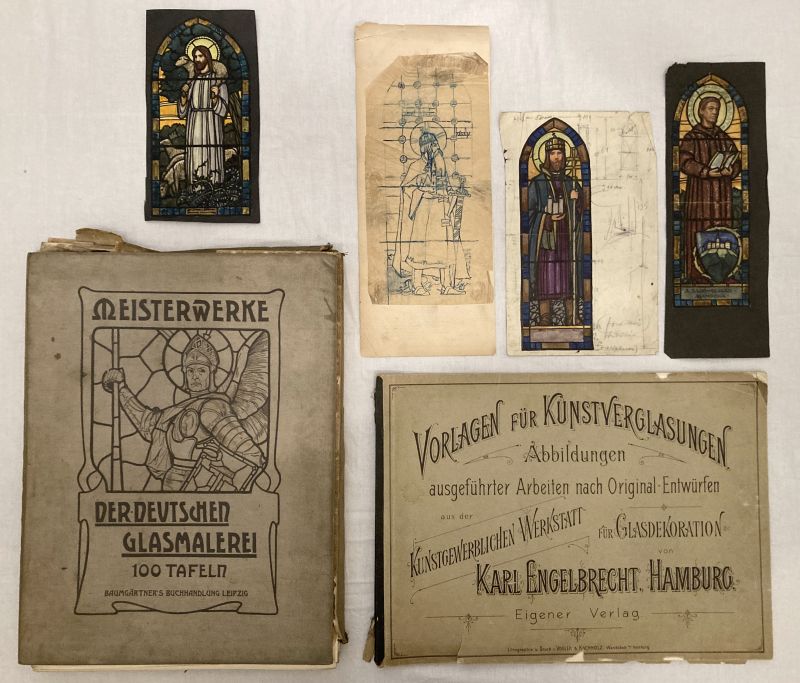 német nyelvű katalógusok a XX.század elejéről, 4 üvegablak terv - egyedi grafikák, 2 kis katalógus: Nagy Sándor, Árkayné Sztehlo Lili
