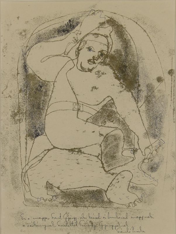 " Ez a magyar Szent György aki kézzel és bunkóval megy neki a sárkánynak. Szeretettel Sümegi Györgyéknek Szántó Piroska"